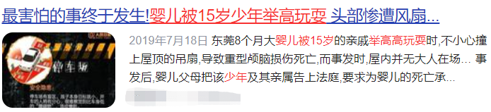 2018年,广东东莞8个月大婴儿被15岁的亲戚举高高玩耍时,不慎撞上屋顶吊扇,导致重型颅脑损伤死亡……
