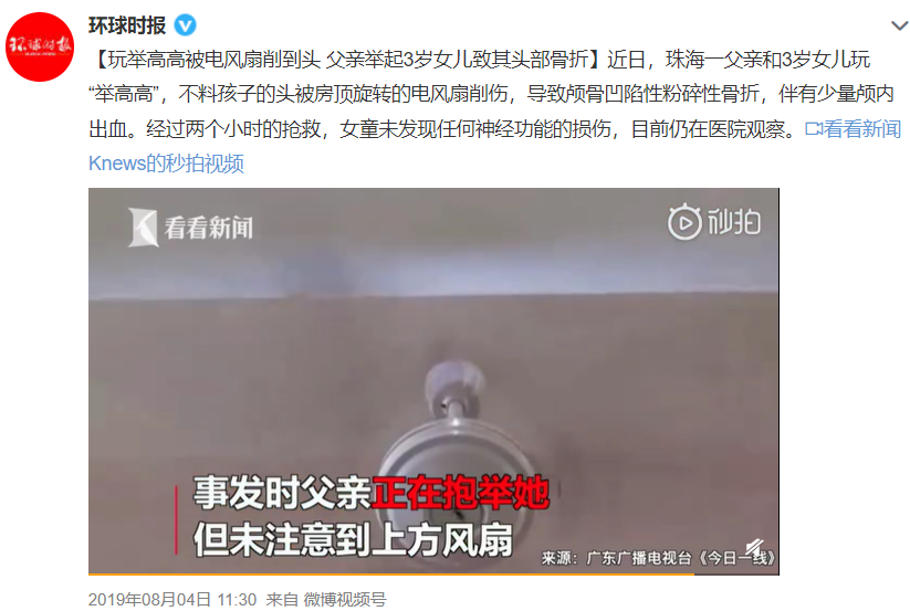 2019年,广东珠海一位爸爸将3岁女儿举高高时,忘记了头顶旋转的吊扇,结果叶片瞬间从孩子头上削过,鲜血直流……