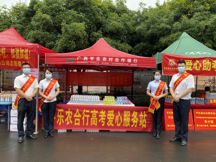 高考期间,平乐农合行党委组织党员志愿者和青年志愿者在平乐中学考点设立助力高考爱心服务站,为考生和家长提供贴心服务。