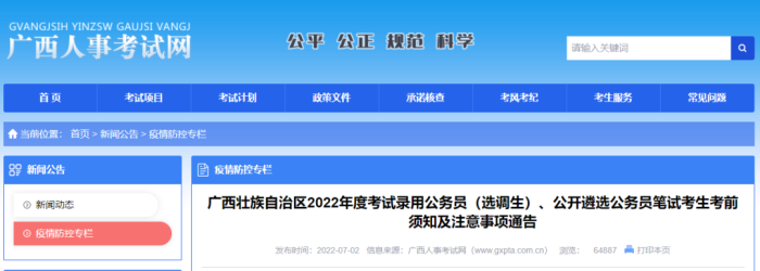 广西2022年度考试录用公务员(选调生)、公开遴选公务员笔试将于7月9日正式开考!日前,广西人事考试院发布通告称,不按要求报备的,进入考点时将被疫情防控自动核验设备拦截,需到“人工核验通道”现场进行疫情防控信息流调和评估,因此影响考生正常考试的后果由考生自行承担。