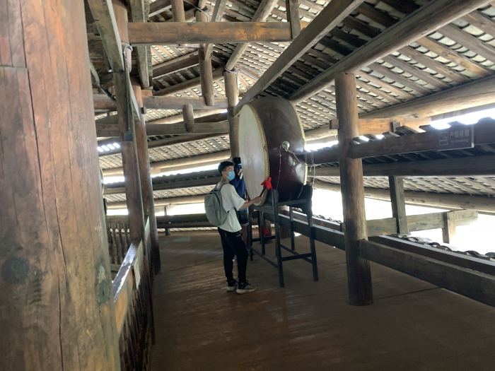 此外,团队成员通过多方采访、调研,了解了当地民众对于三江鼓楼与侗族传统文化的认识。得知在侗族历史上,凡有重大事宜商议、起款定约、抵御外来骚扰,均击鼓以号召群众,因此无事是不能随意登楼击鼓的。团队成员也亲身体验了一番在鼓楼击鼓,不愧是千里传音,余音绕梁。