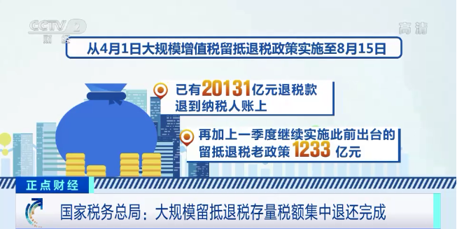 据介绍,从4月1日大规模增值税留抵退税政策实施至8月15日,已有20131亿元退税款退到纳税人账上,再加上一季度继续实施此前出台的留抵退税老政策1233亿元,已累计有21364亿元退税款退到纳税人账户。今年留抵退税规模超前三年总和,政策落地不断提速,原定全年退税任务提前到二季度集中完成。