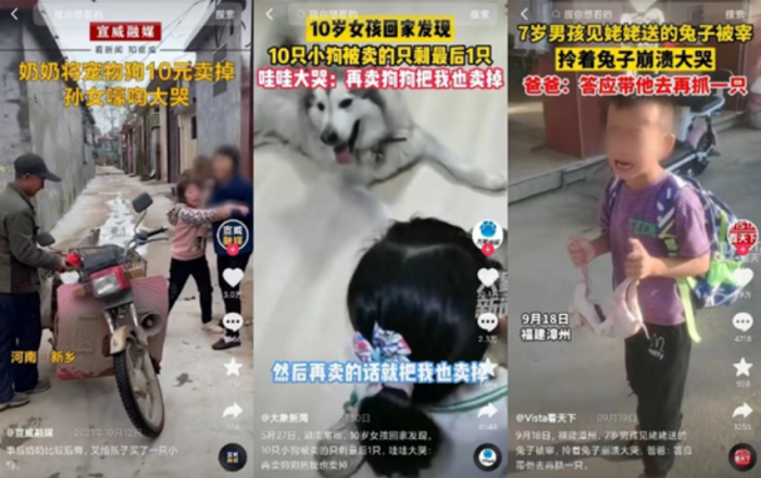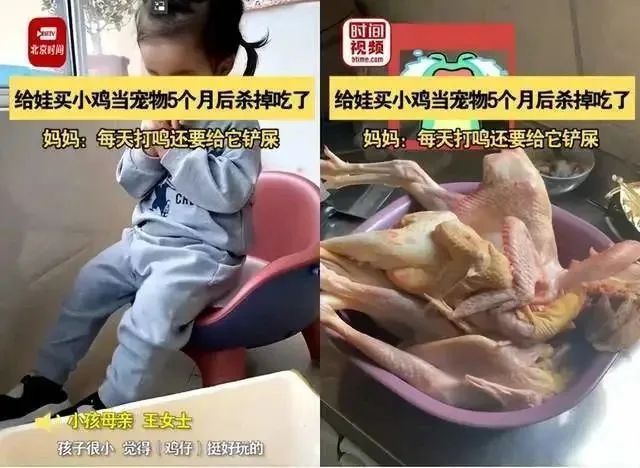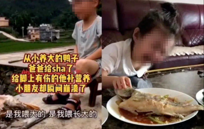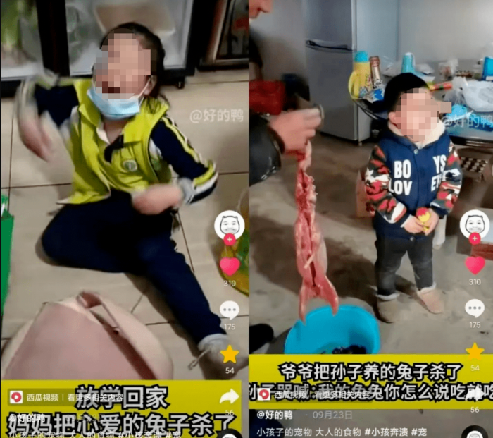 这个画面出自近日流行于某短视频平台的一条视频。加上轻松的配乐、搞笑的表情,这条“萌娃搞笑视频”登上热搜。类似的视频还有不少,只是下锅的宠物换成了兔子、鸡、鸭、鱼等。虽然这类视频流量很高,但不少网友并不买账:“家长把孩子的宠物杀了做熟了,喂给哭着的孩子,这样很有趣?”“父母这样做,一点不尊重孩子。”