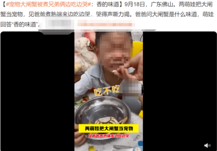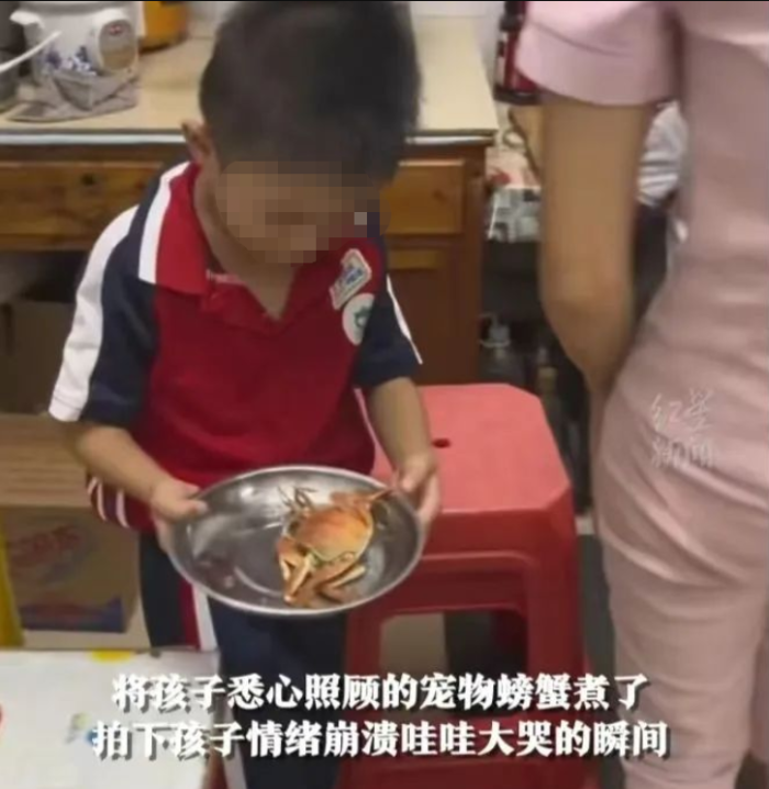 家长将孩子悉心照顾的宠物螃蟹煮了,递给孩子一只螃蟹腿,嘴里说着“吃不吃,不吃我吃了”,孩子一边撕心裂肺地哭一边接过螃蟹腿,放进嘴里说“香”。