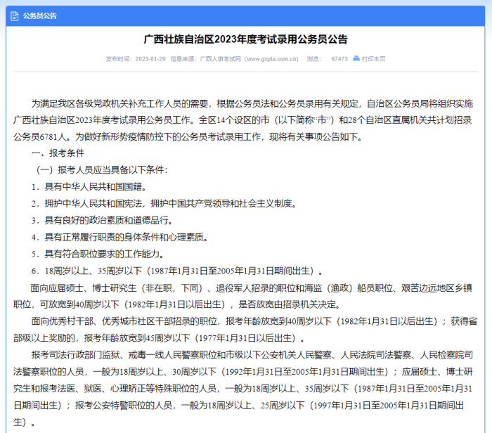 1月29日,广西2023年度考试录用公务员公告及招录职位表发布,共计划招录公务员6781人,其中桂林将招录532人。1月31日起报名,2月25日笔试。部分人群45周岁以下仍有报考机会。
