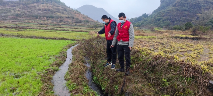 张毅峰(左一)邀请镇水利部门现场勘查水渠。廖彦玮 摄