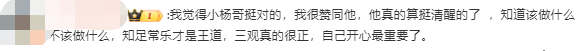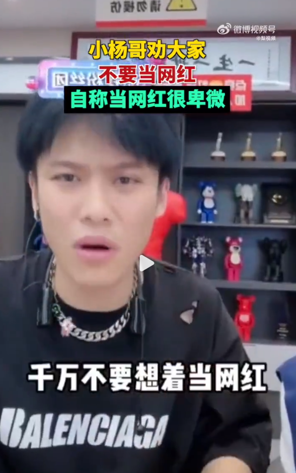 小杨哥在直播中表示,“别发大财,发那么大财干什么,我和你说发小财是最快活的,不要发大财!你发大财了,你要想想这个财怎样才能长久,发小财差不多够自己用,知足常乐。”当有网友表示对其收入羡慕,他回复:“不要羡慕,羡慕啥呀,我要知足常乐,人就这一辈子!我现在要是去买个轮船的话又舆论了,我能买吗?我不能买!我啥都不能干,我以前还喜欢去酒吧蹦迪,我现在能去吗?一去又被别人说。”此前小杨哥曾在直播间劝大家千万不要想着当网红,他谈道:“当网红并不是一个很光荣的职业,这是我7年玩网络总结的经验,千万不要当,网红很卑微。”