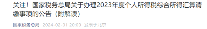 2月1日,国家税务总局发布关于办理2023年度个人所得税综合所得汇算清缴事项的公告,2023年度汇算办理时间为2024年3月1日至6月30日。