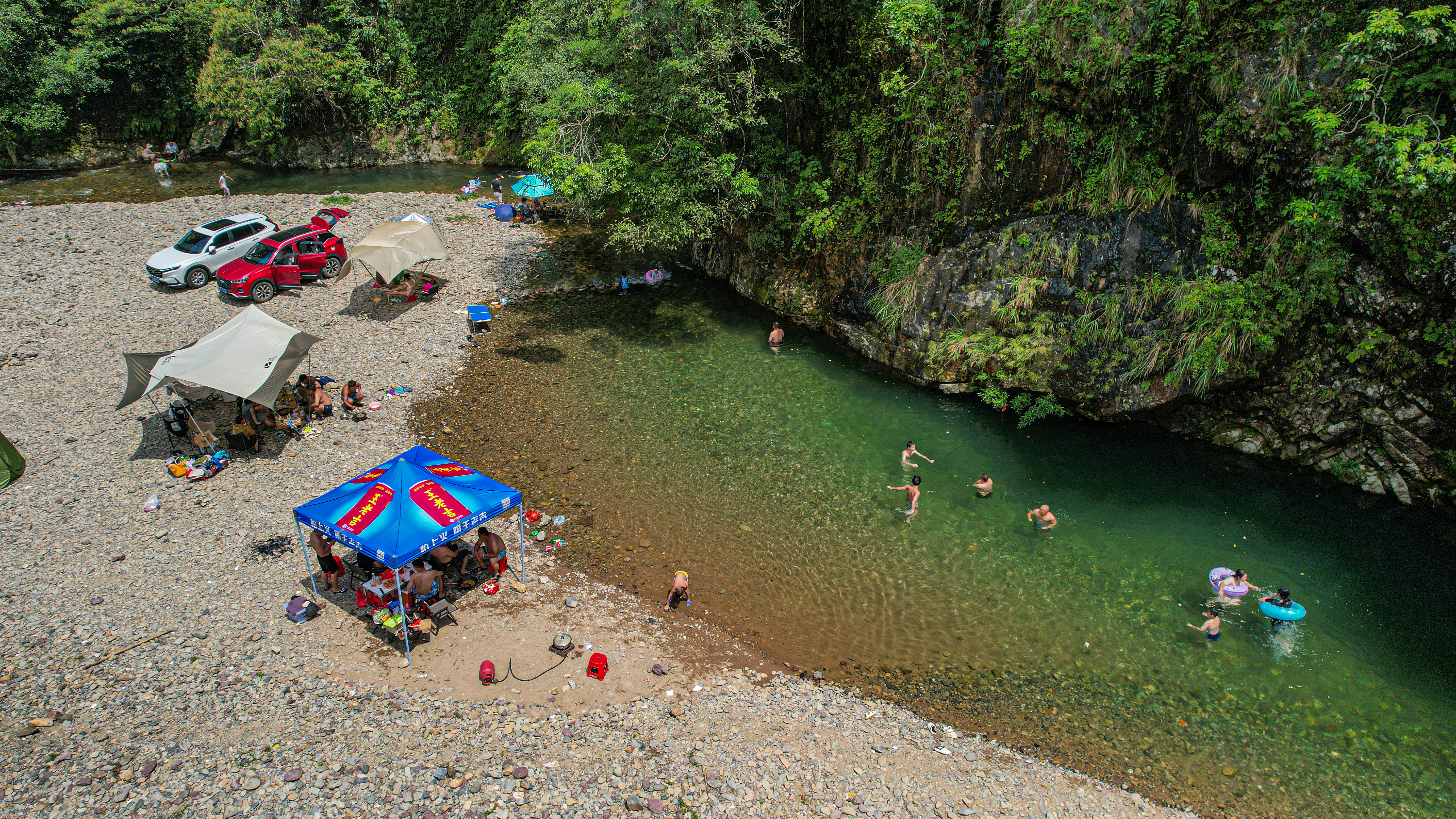 近日,随着气温持续攀升,在桂林市灵川县公平乡和平村委捞内村,一处隐匿于山区的小众景点因清澈凉爽的“果冻水”成为游客们夏日避暑的热门选择。大量游客从外地和市区赶来,在流丰河这片清凉水域嬉戏玩水,享受夏日里难得的惬意时光。