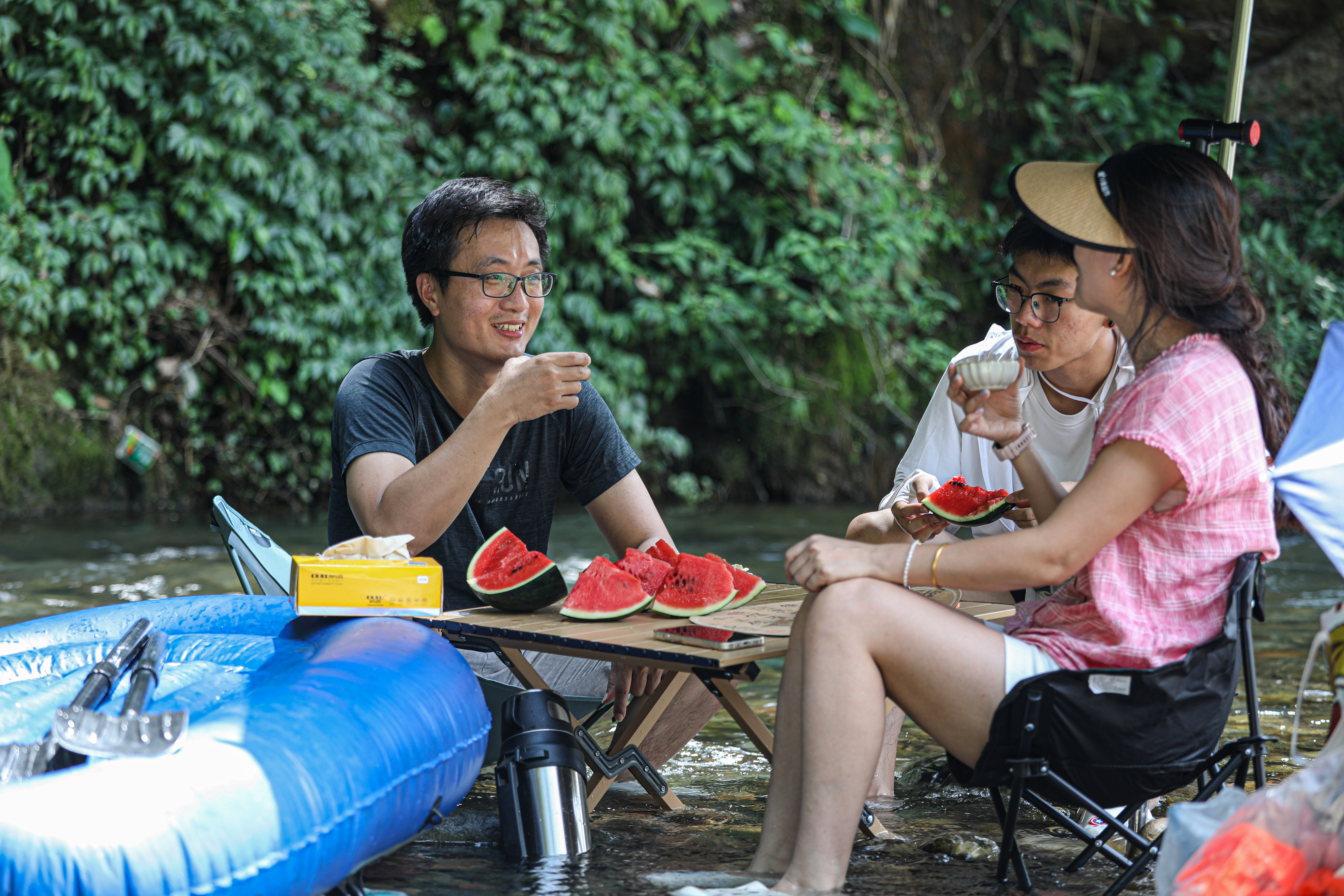 这处景点的水质极佳,水底的沙石清晰可见。在阳光的折射下,深处水体呈现出迷人的蓝绿色,如同果冻般晶莹剔透,人们亲切地称之为“果冻水”。夏日的山涧“果冻水”域,孩子们在水中嬉戏,水枪滋出的水线交织,有的套着泳圈划水,笑声阵阵。浅滩处,大人们围坐在一起野餐说笑,脚下是沁凉的浅水,耳边是潺潺的水声和偶尔掠过的风声,这份临水而坐的惬意,把暑气都减少了几分。整个景区水声、笑语相融,一派热闹的避暑图景。许多游客纷纷表示,这里不仅水质好,周边的自然环境也十分清幽,是远离城市喧嚣、亲近大自然的理想之地。