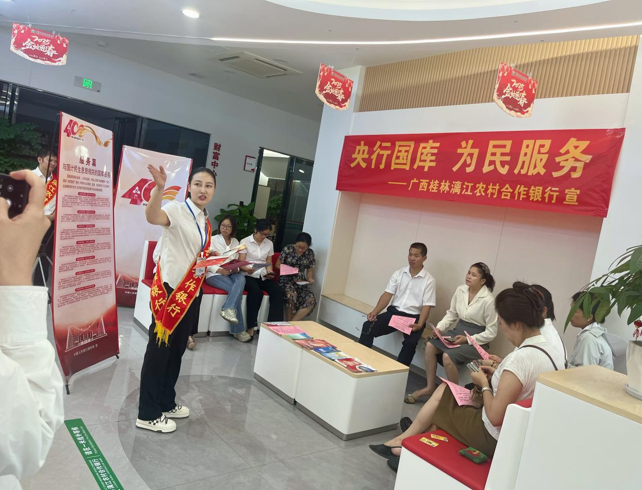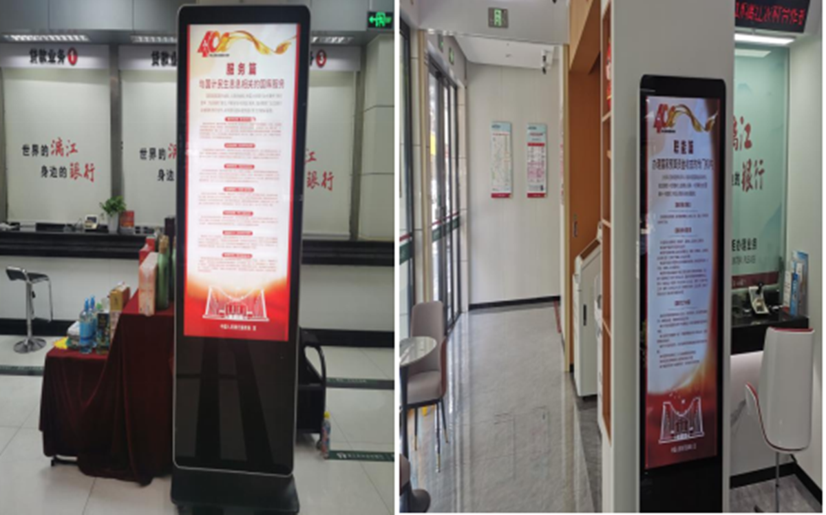 漓江农合行充分发挥营业网点宣传阵地作用,在全辖35个营业网点LED显示屏、广告机等滚动播放“国库征程四十载 同心聚力启新程”、“国库为民守初心 服务发展担使命”等宣传标语以及宣传图片和宣传视频,积极营造浓厚的宣传氛围,吸引更多的群众了解国库知识,让大家切实感受到国库与日常生活的紧密联系,提升社会公众对国库工作的认知度,增强公众对国库服务的信任和支持。