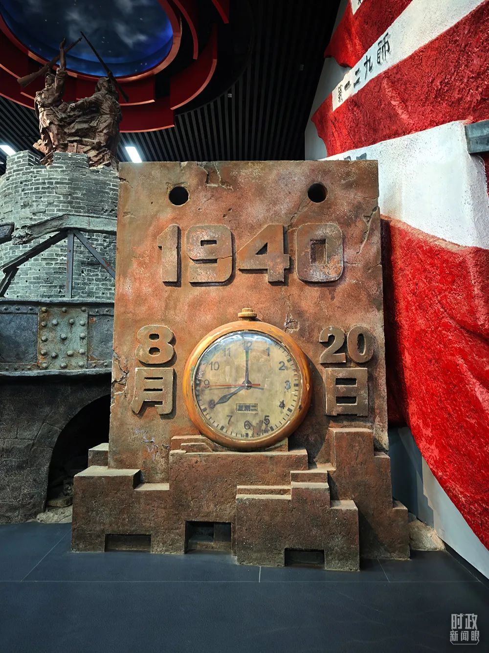 纪念馆入口的时钟雕塑,指针定格在1940年8月20日20时,这是百团大战打响的时间。时钟雕塑背后,沿模拟山石搭建的步道走进数字展厅,仿佛站在山顶,眺望远处腾空的炮火、俯冲的敌机和战士们一次又一次冲锋。