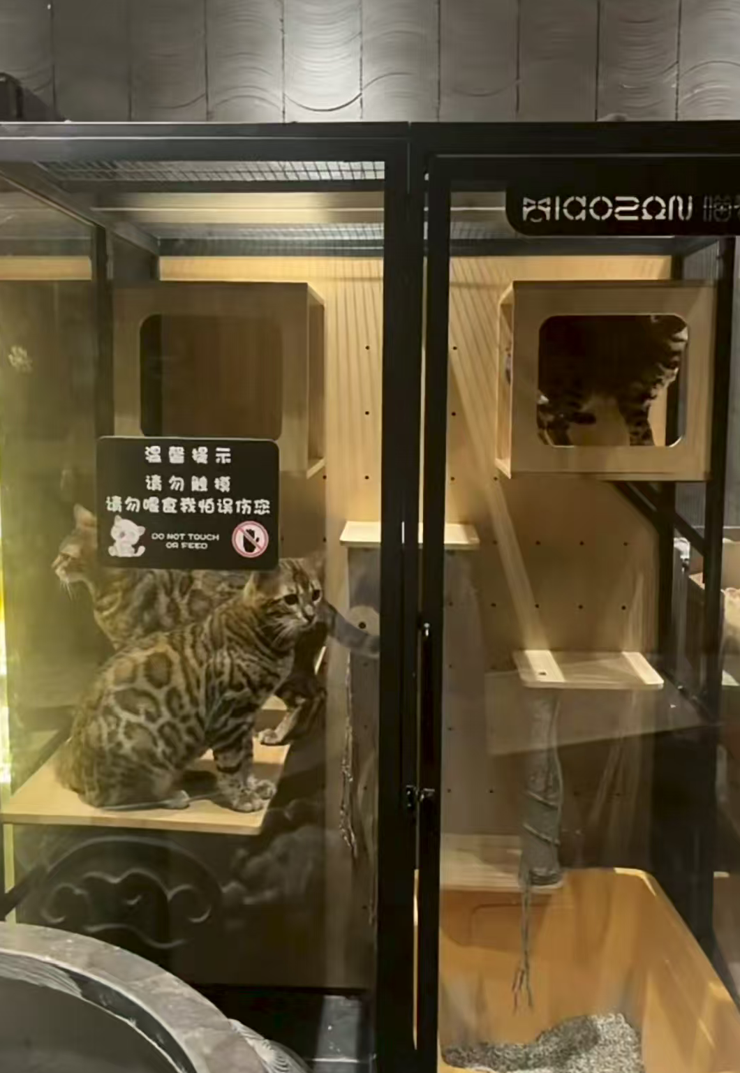 值得注意的是,李女士提供的酒店公共区域的猫笼照片显示,酒店放置了“请勿触摸”等提醒标记。
