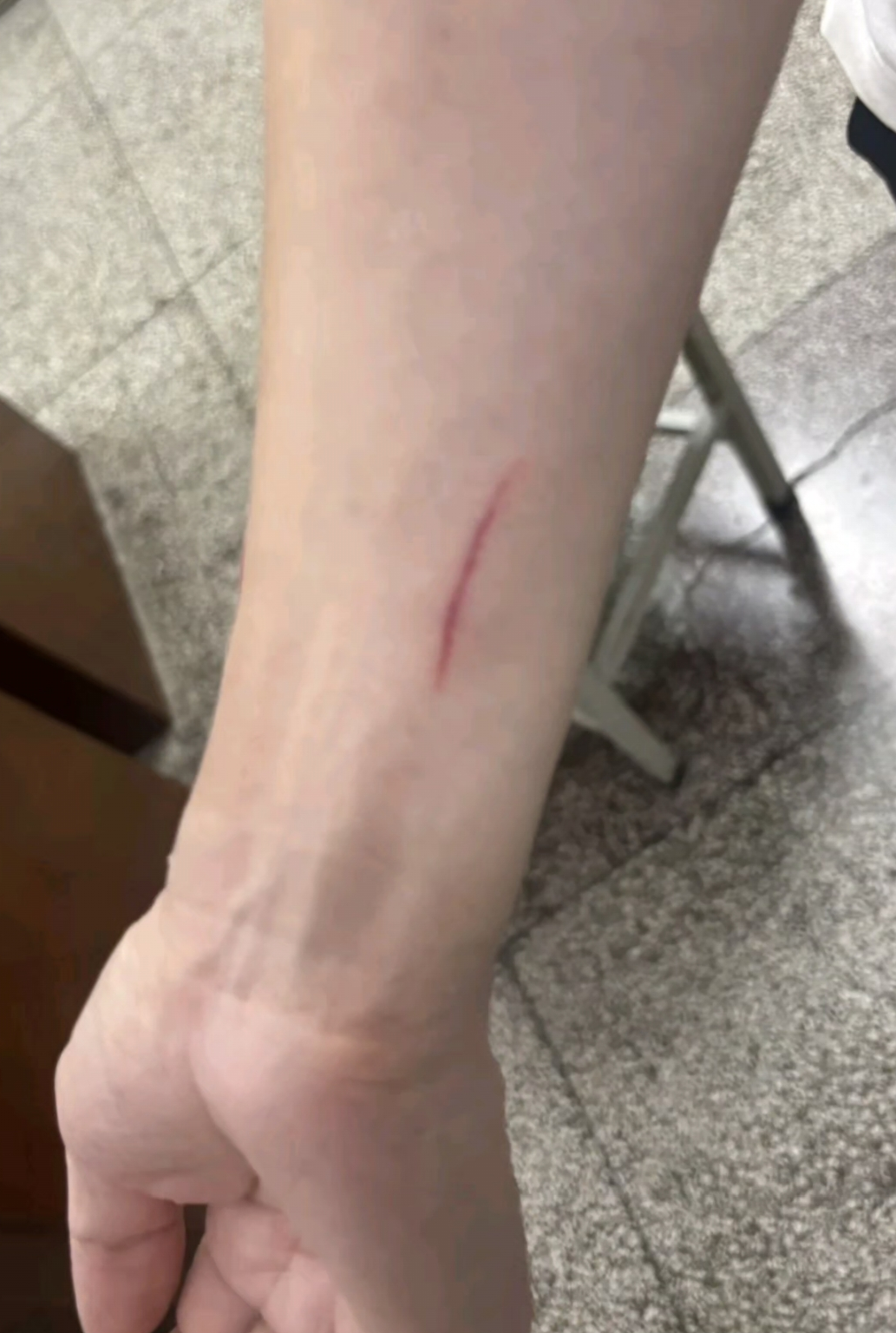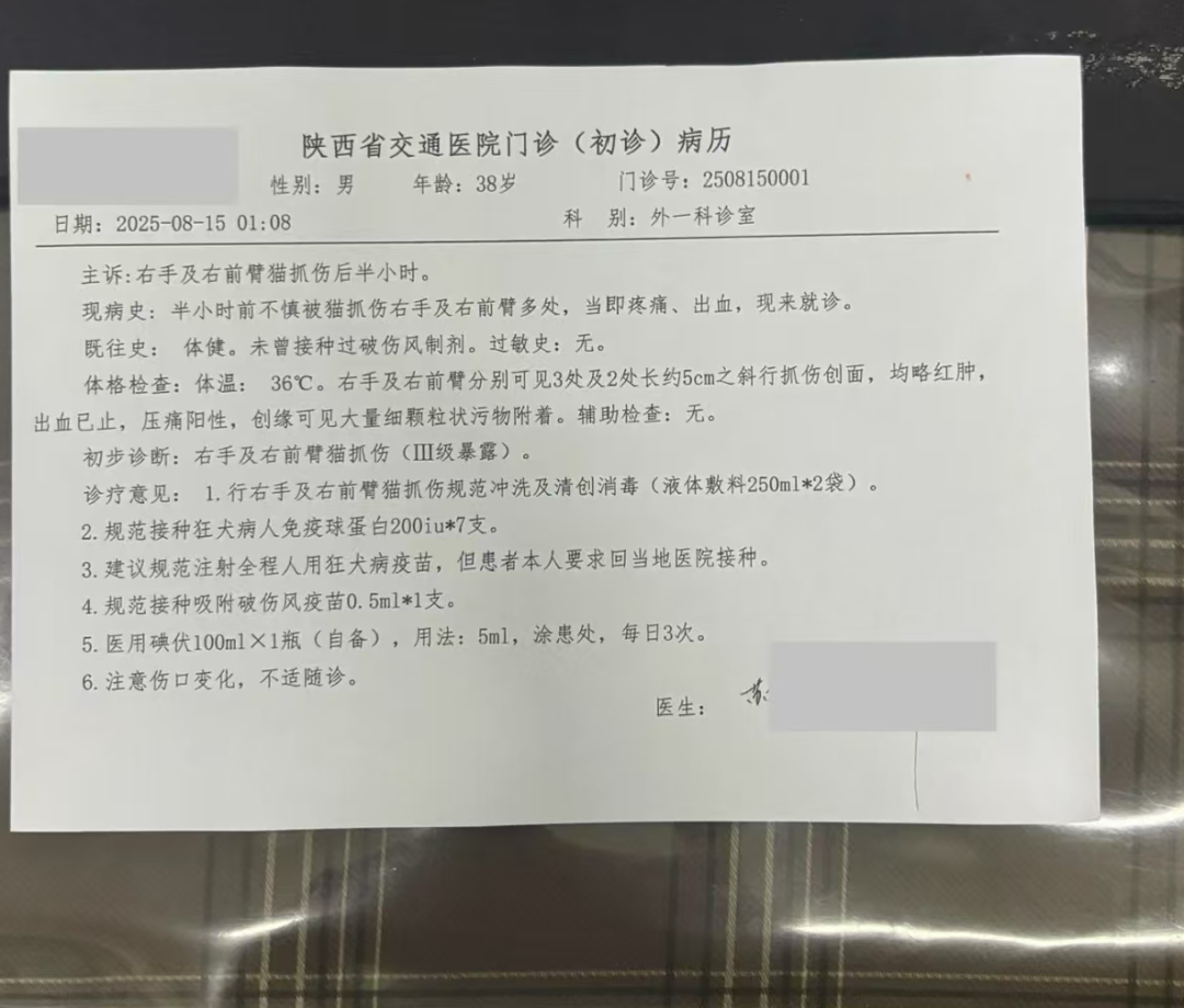 当事人李女士告诉羊城晚报记者,15日凌晨,她和家人游玩后回到酒店,开门瞬间一只猫从门缝跑出酒店外,其丈夫在将猫抱回过程中被抓伤。李女士提供的门诊病历显示,她丈夫的右手及右前臂多处被抓伤,为“三级暴露”,其中有创面长约5cm。