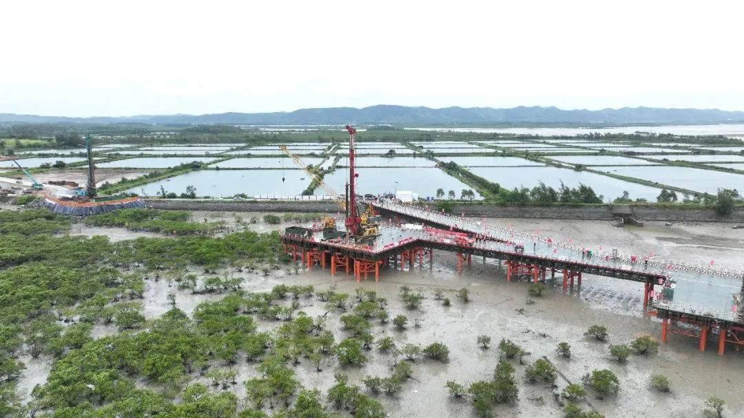 合湛高铁铁山港跨海特大桥位于广西北海市合浦县境内,全长8473.478米,是合湛高铁全线重点控制性工程,也是目前广西最长的跨海铁路桥梁。施工过程中需要克服潮汐落差大、高盐雾侵蚀、台风强度大等影响,难度较大。