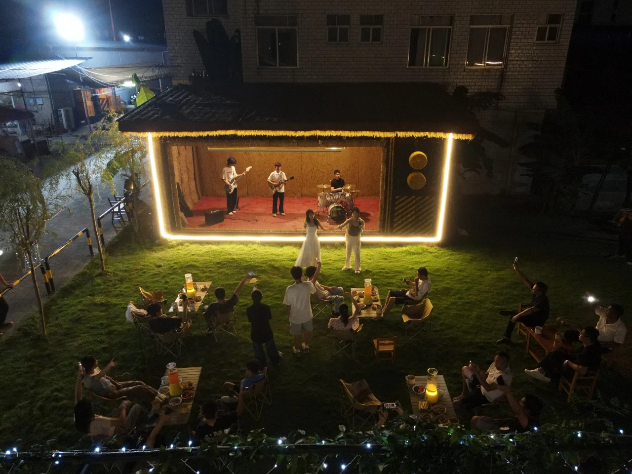 在“合心桃花源”的墙上,随处可见乡土文化。丰收的粮食、稻草堆、朝阳河缩影等乡土元素融入壁画创作,并配以“桂林话”方言文字,以生活化的场景载体,让游客在游玩过程中直观感受桂林本土文化魅力。夜幕降临,“乡村小酒馆”点燃了这里的“夜经济”,成为了一张亮眼的“网红名片”。在每周五晚间,这里会有现场乐队准时驻场,民谣、轻曲轮番上演,游客们可以参与互动唱歌,这样的新场景让乡村的夜晚不仅有田园静谧,更添文化活力,丰富了乡村文旅体验的层次感。