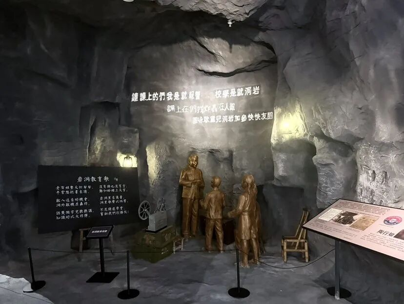 移步至“岩洞教育”复原展区,耳边传来悠扬而坚定的《岩洞教育歌》,歌声里“岩洞作课堂,烽火伴书声”的信念直抵人心。斑驳的岩壁上,用白漆书写的“岩洞就是学校,警报就是我们的上课钟,敌人在轰炸,我们在上课”标语格外醒目,旁边还陈列着师生上课的场景复原。岩洞中坚持办学、守护文化火种的感人画面,让人深刻体会到“教育救国”的坚韧与担当。