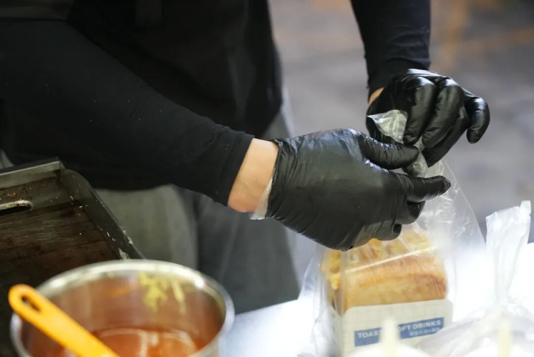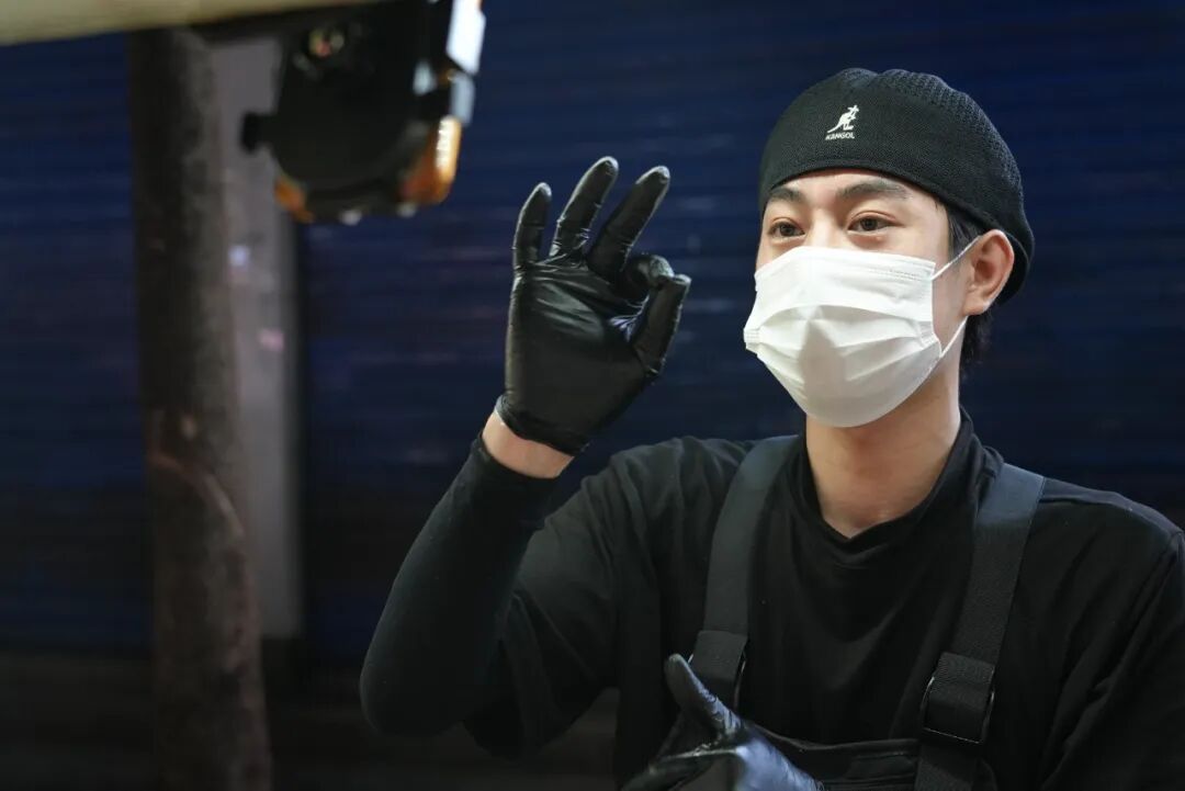 杨健的小摊售卖热狗、意面、爆蛋吐司等小吃,只见他戴着口罩和手套,双手挥舞着手中的工具。杨健的摊位十分整洁,每做完一单,他都要及时清理制作台。