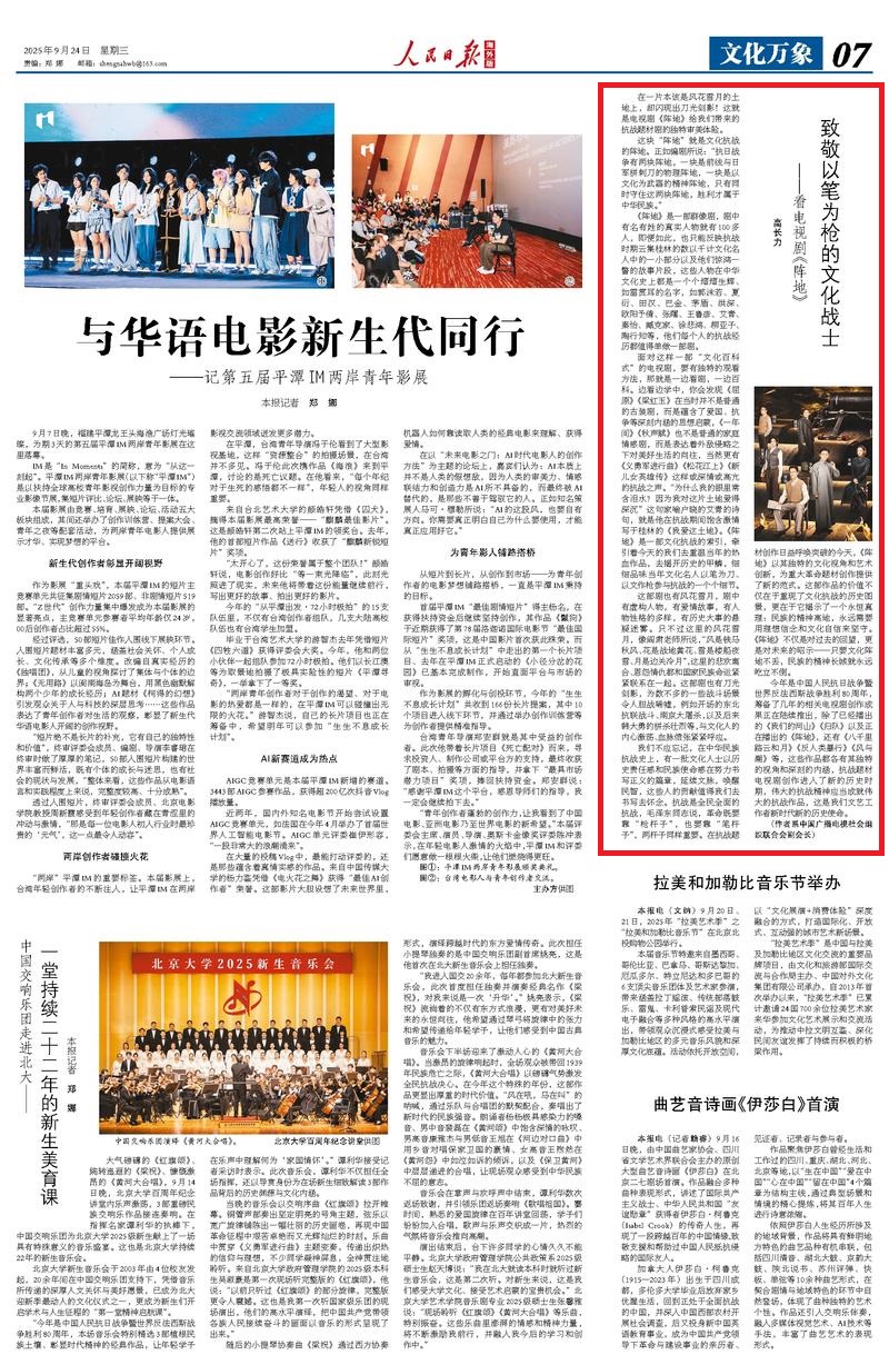我们不应忘记,在中华民族抗战史上,有一批文化人士以历史责任感和民族使命感在努力书写正义的篇章,延续文脉,唤醒民智,这些人的贡献值得我们去书写去怀念。抗战是全民全面的抗战,毛泽东同志说,革命既要靠“枪杆子”,也要靠“笔杆子”,两杆子同样重要。在抗战题材创作日益呼唤突破的今天,《阵地》以其独特的文化视角和艺术创新,为重大革命题材创作提供了新的范式。这部作品的价值不仅在于重现了文化抗战的历史图景,更在于它揭示了一个永恒真理:民族的精神高地,永远需要用理想信念和文化自信来坚守。《阵地》不仅是对过去的回望,更是对未来的昭示——只要文化阵地不丢,民族的精神长城就永远屹立不倒。
