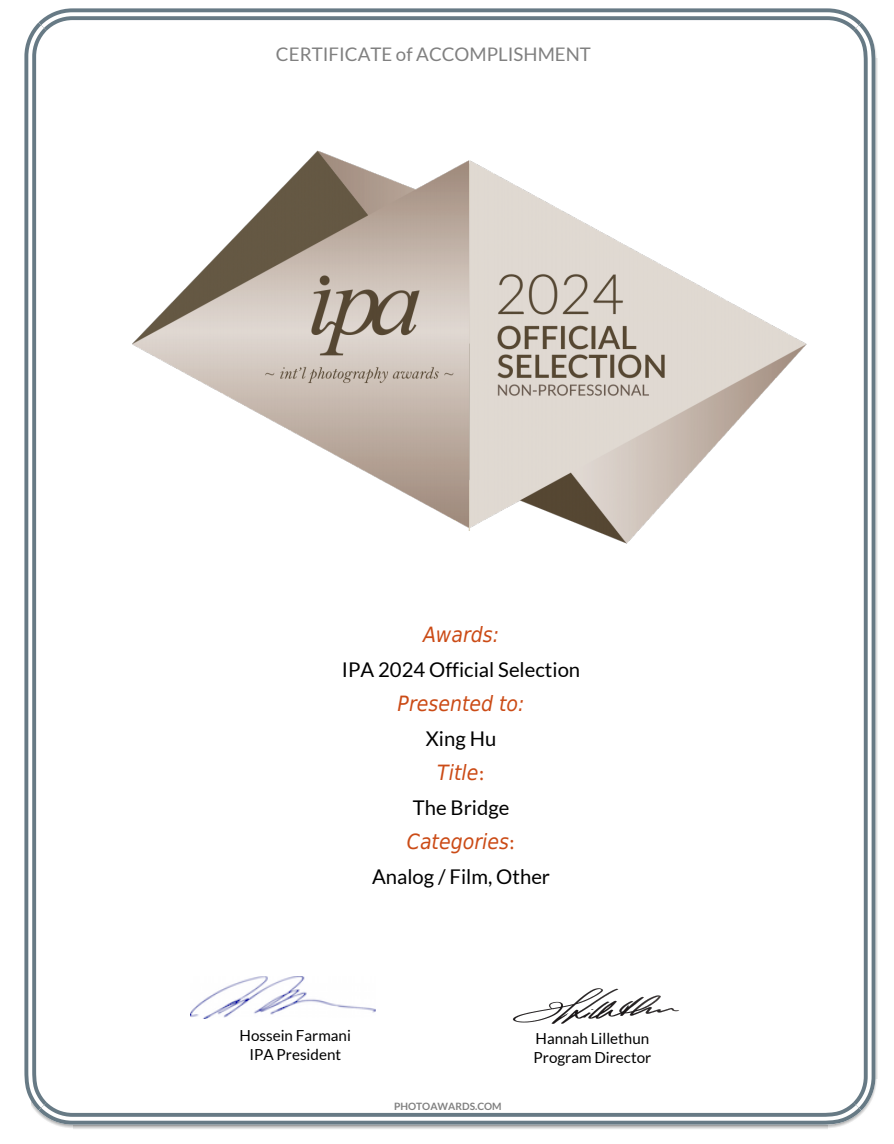 除本次PX3金奖外,作品《桥》(Bridge)亦曾于2024年获得国际摄影奖(International Photography Awards,简称IPA摄影奖)公开组胶片类别荣誉奖(Honorable Mention)及官方提名(Official Selection)。