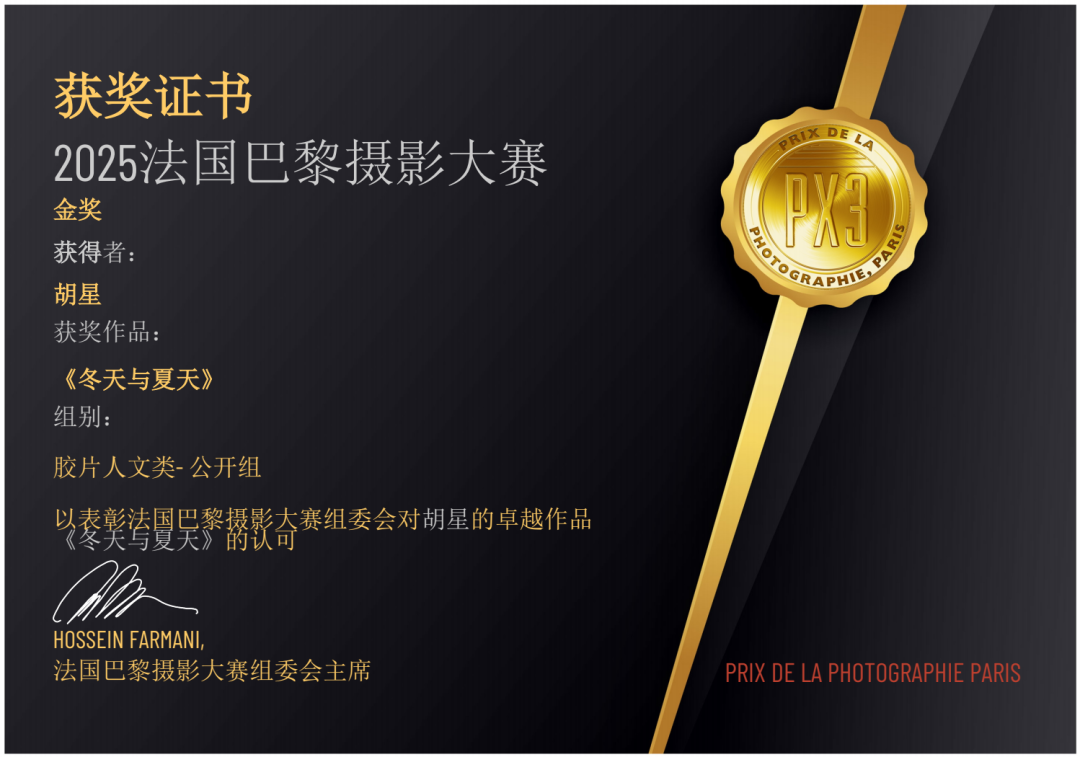9月17日,2025年法国巴黎摄影大奖赛(Prix de la Photographie Paris,简称PX3摄影奖)获奖名单正式公布。桂林青年摄影师胡星凭借作品《冬天与夏天》(Winter and Summer)摘得公开组胶片/人文类别金奖(Gold),成为本届赛事中备受瞩目的亚洲摄影师之一。