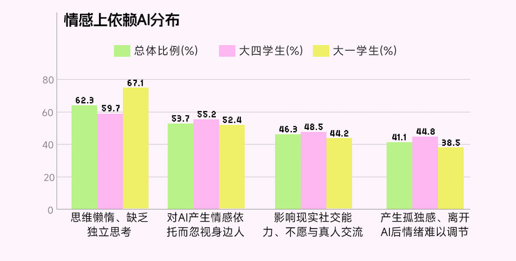 调查显示,40.9%的受访大学生担心对AI产生难以割舍的心理依赖。他们最核心的担忧,是过度依赖AI会使思维变得懒惰、缺乏独立思考和解决问题的能力(62.3%),此外还有对AI产生情感依托而忽视身边人(占比53.7%),影响现实社交能力等。
