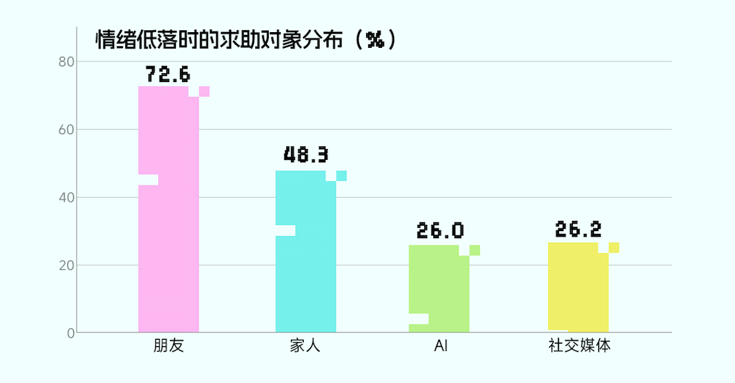 值得一提的是,朋友仍是受访大学生在情绪低落时的首要倾诉对象(72.6%),印证了线下关系在情感支持系统中的不可替代性,反映了他们对情感联结的真实性与安全感仍有着本质需求。