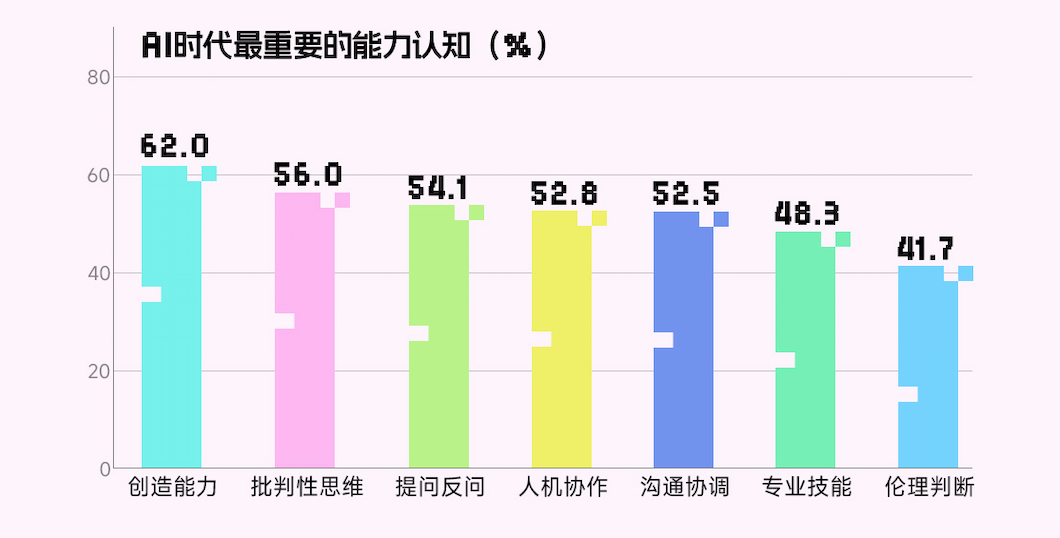 在受访者看来,创造能力(62.0%)、批判性思维(56.0%)是AI时代最重要的能力,提问反思(54.1%)、人机协作(52.8%)、沟通协调(52.5%)同样必不可少。