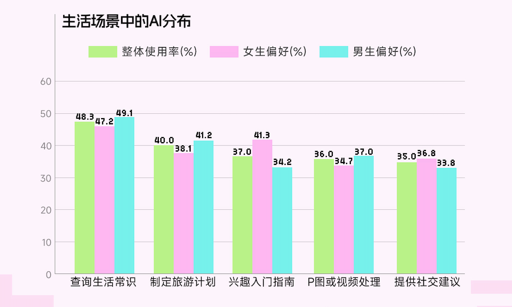 生活场景中,查询生活常识(48.3%)、制订旅游计划(40.3%)、提供运动艺术等入门指南(37.0%)、修图或视频处理(36.3%)和提供社交建议(35.0%)是AI在受访大学生生活中应用相对更广泛的场景。