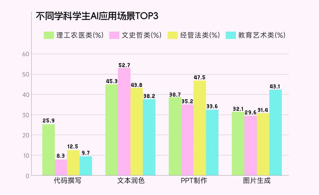 资料文献查询、文本润色、翻译和总结汇报等文稿撰写是受访大学生群体最广泛的AI应用场景,占比均超43.0%。调查发现,大一大二的学生在“资料查询、图片生成、口语训练、知识学习、翻译、模拟面试”等场景中应用AI更多。而大三大四的学生在“求职建议、数据统计、代码撰写、音视频剪辑、会议记录”等场景中更多使用AI。