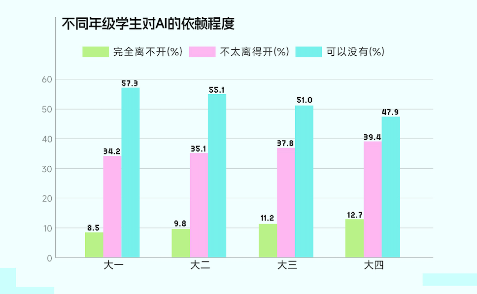 美国教育技术专家Marc Prensky在2001年提出“数字原住民”(Digital Natives)概念时或许未曾预料到,20年后AI技术会重新定义这一群体的认知范式。调查显示,受访大学生群体中AI渗透率已达99.2%。47.1%受访大学生已经离不开AI,其中10.5%受访者完全离不开,36.5%受访者表示不太离得开。