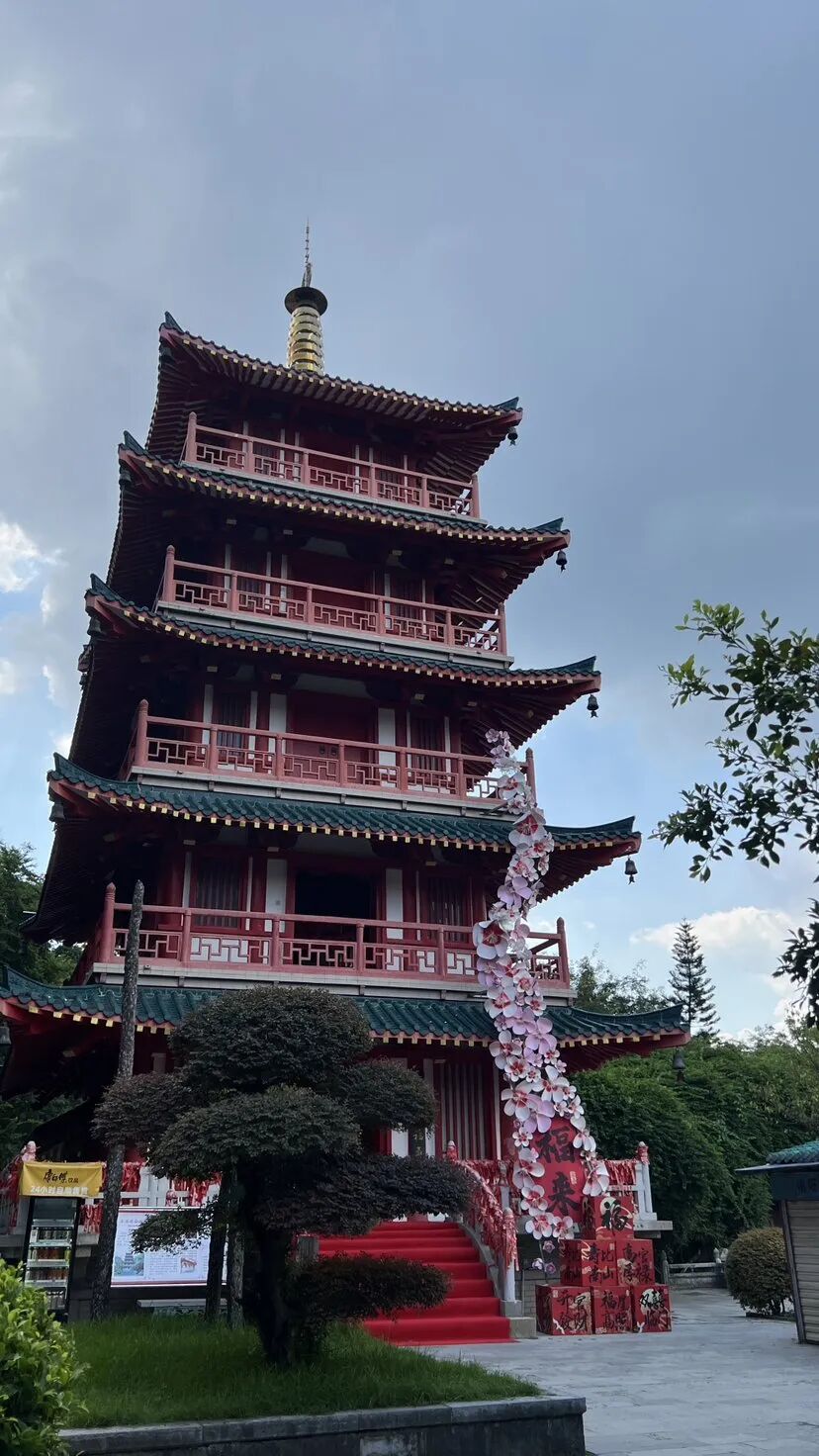 虞山公园位于桂林市北部虞山桥附近,因虞山而得名。五福塔处于虞山公园的南园景区。五福塔以中国传统吉语“五福临门”命名,造型犹如楼阁,塔内悬挂着“平安钟”,寓意祈福国泰民安。五福塔高29米,为五层仿木结构。塔身朱红色粱柱,宝蓝色瓦顶,搭配金灿灿的九轮鎏金塔刹,显得金碧辉煌。每个塔檐四角都挂着铁马铜铃,微风吹动,叮当作响,为公园增添了一份古朴的氛围。