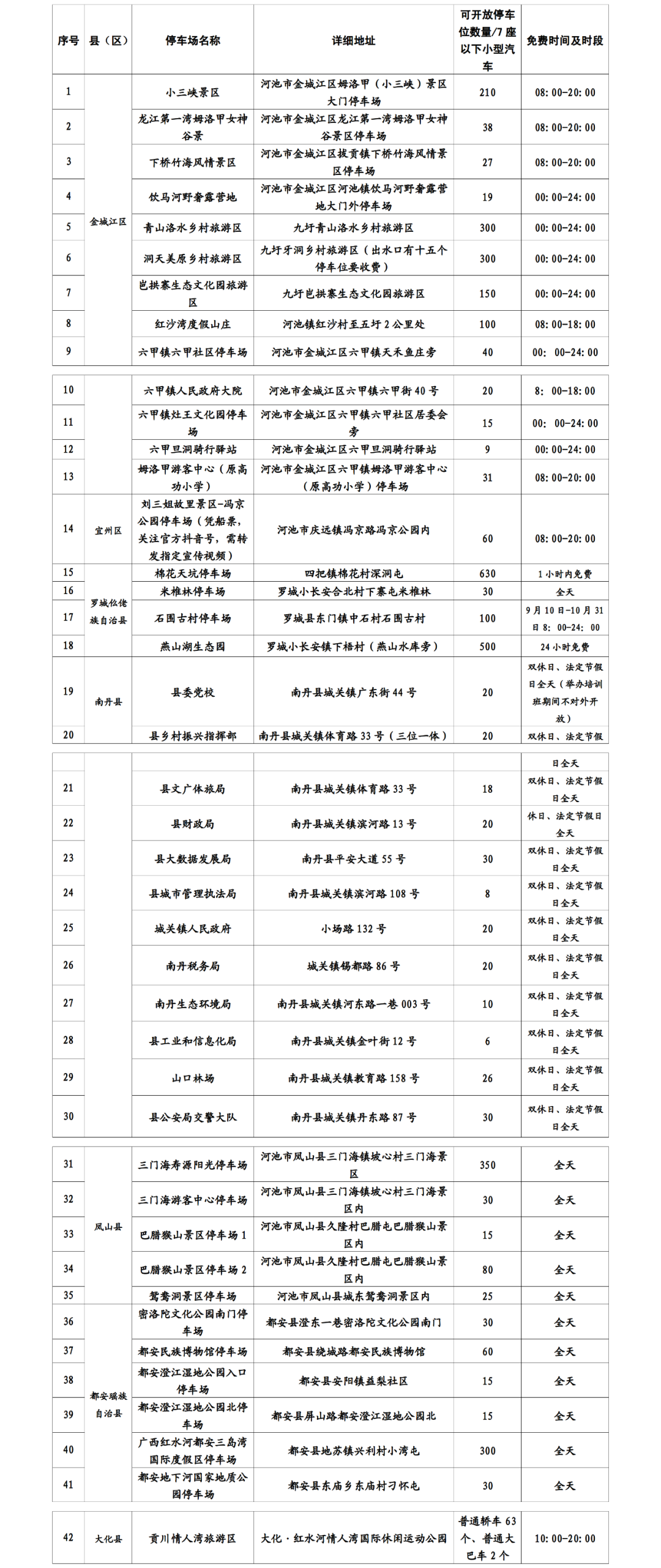 为让大家轻松畅游,河池7个县(区)贴心开放超3800+免费停车位,涵盖热门景区、城区核心区及文化场馆周边,国庆、中秋“双节”期间(10月1日至8日)停车场免费开放。