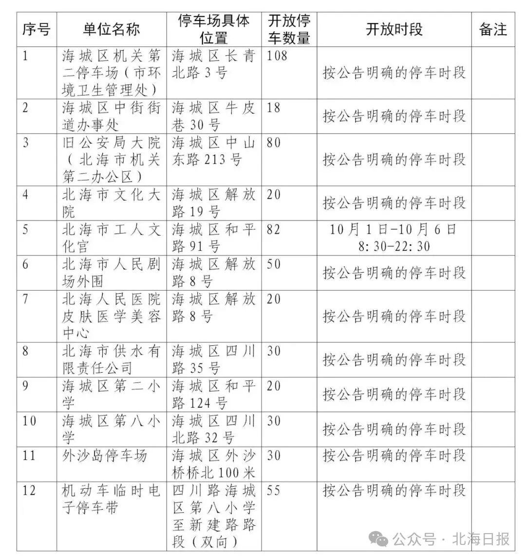 为缓解游客在北海老街景区的停车难问题,经市政府同意,2025年国庆、中秋假期期间免费开放老街景区附近部分停车场及部分路段。现公告如下: