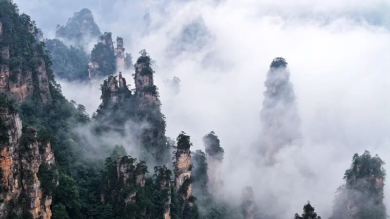 踏入张家界国家森林公园,仿佛置身于一幅水墨丹青之中。三千座奇峰拔地而起,如刀劈斧削般直插云霄,气势磅礴,蔚为壮观。