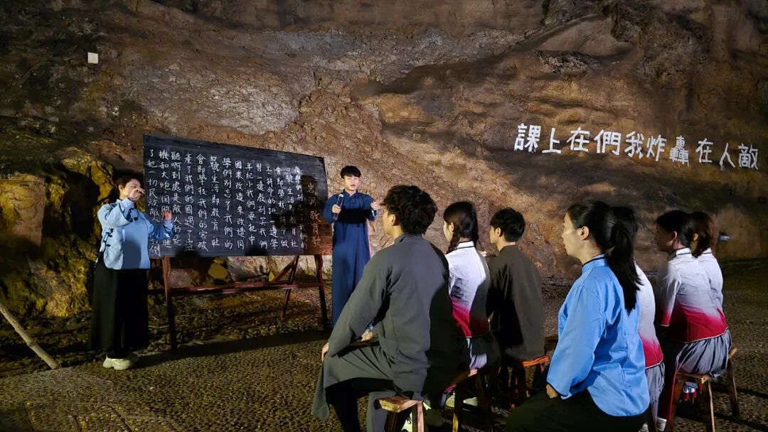 在《阵地》的拍摄取景地,景区精心安排了场景还原:当游客沿着铺设完善的步道行走,还未抵达核心区域,便能远远听到一阵阵嘹亮而激昂的歌声从岩洞深处传来。那是沉浸式舞台剧中“爱国动员课堂”的环节,演员们正带领游客高唱抗战歌曲。歌声在溶洞独特的混响效果中回荡,格外具有穿透力与感染力,瞬间将人们的思绪拉回到那个烽火连天的年代。
