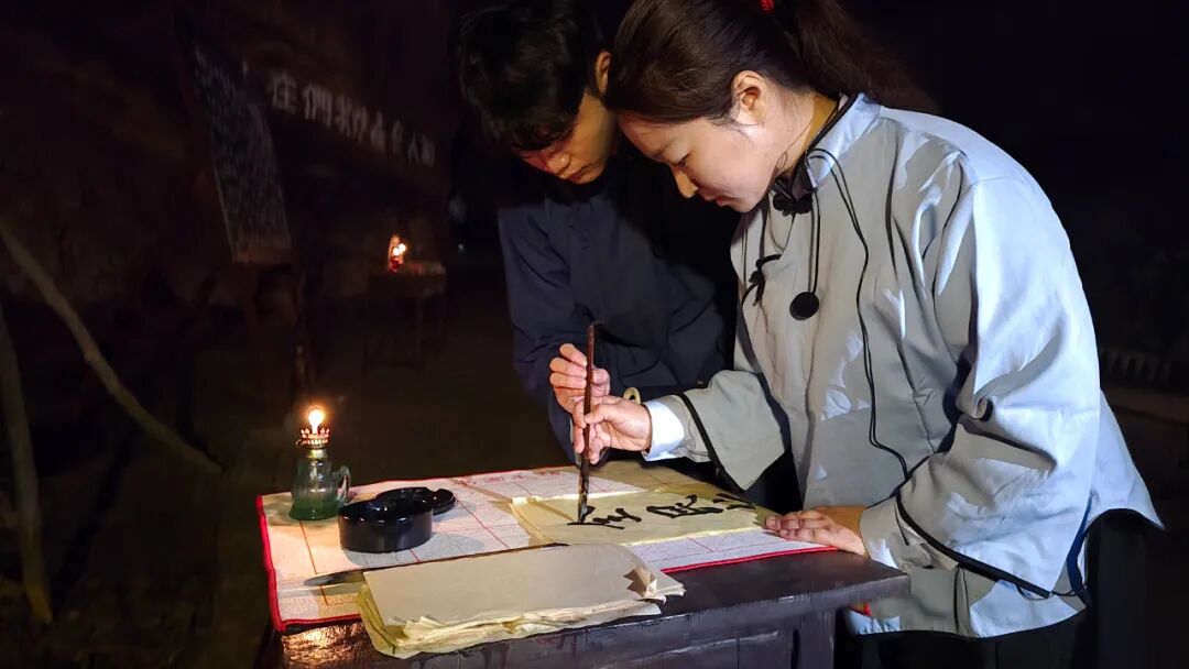 岩洞内,可以观看沉浸式舞台剧“爱国动员课堂”。在微弱的油灯下,游客们可以搬着小板凳围坐成一圈,聆听“激情澎湃的爱国课”。游客还可以亲手书写“抗日救亡”或祝福祖国的标语作为纪念,也可以换上精致的民国服装在复原场景中拍照打卡。