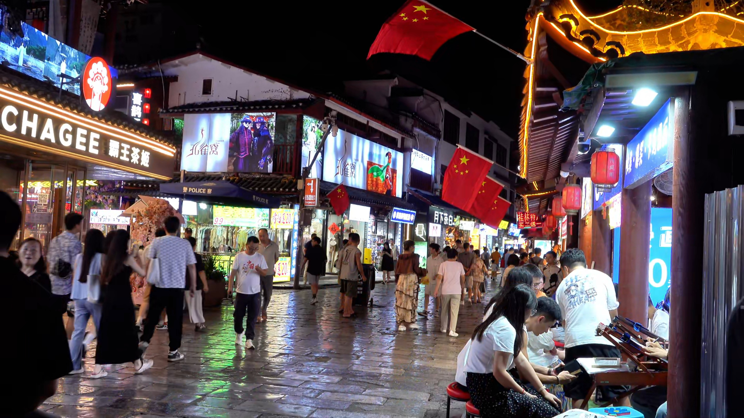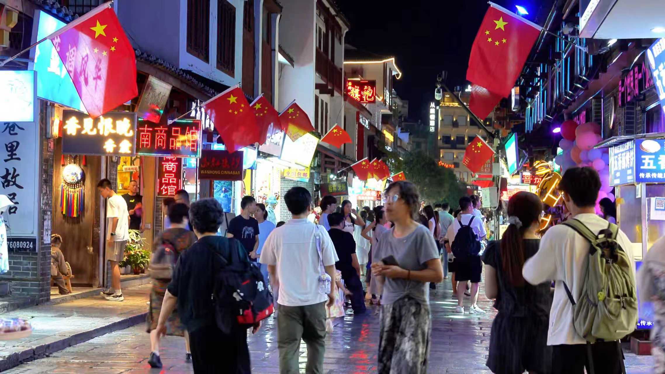 西街作为阳朔的“烟火名片”,被浓厚的节日氛围包裹,街道两侧挂满了鲜艳的五星红旗,街边特色美食摊前挤满游客,桂林米粉、阳朔啤酒鱼等当地美食餐饮更是人气爆棚。来自五湖四海的游客汇聚于此,处处都洋溢着欢快祥和的节日气息。