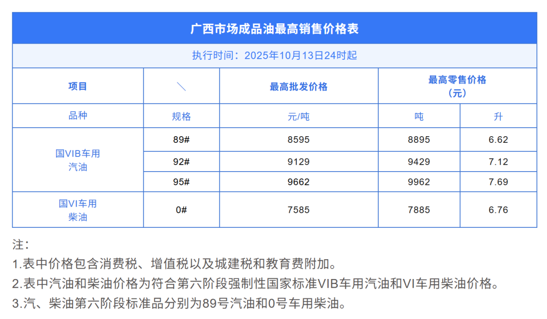 这次成品油价格调整后,我区国VIB标准89号汽油从6.68元/升调整到6.62元/升,每升下调0.06元;92号汽油从7.18元/升调整到7.12元/升,每升下调0.06元;95号汽油从7.75元/升调整到7.69元/升,每升下调0.06元;国VI标准0号车用柴油从6.82元/升调整到6.76元/升,每升下调0.06元。