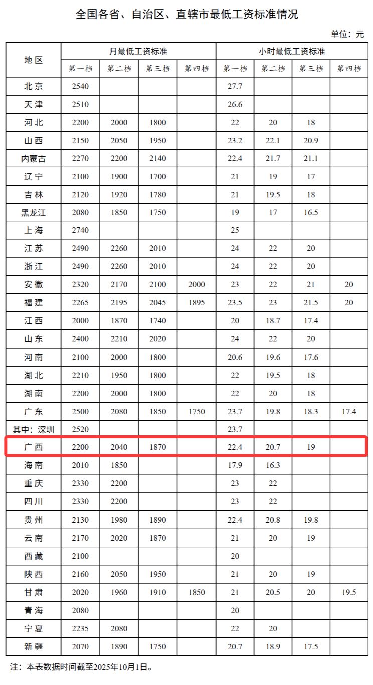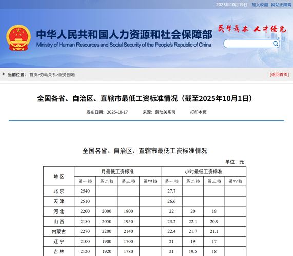 10月17日,人社部官网公布全国各省、自治区、直辖市最低工资标准情况(截至2025年10月1日)。