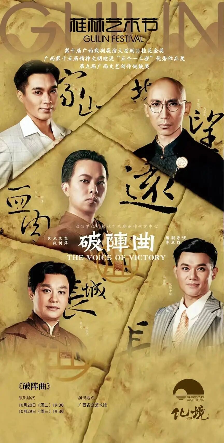 大型桂剧《破阵曲》由桂林市戏剧创作研究中心出品、李卓群编剧、导演,作品以1938-1944年抗战时期桂林“抗战文化城”为背景,采用“群像式”叙事手法,是首部全景展现该时期光辉历史的舞台作品。