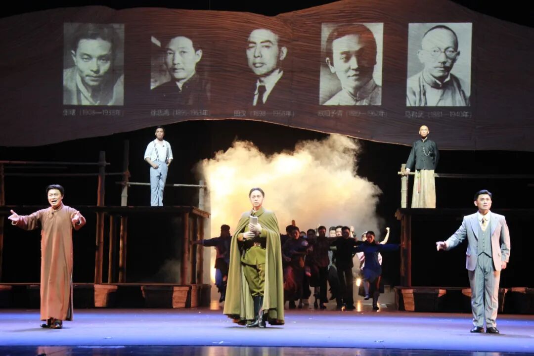 《破阵曲》中,五位主演的精神气质正对应着桂林的五座奇峰:田汉似穿山,“国歌之父”,义勇赤诚;徐悲鸿如叠彩山,丹青妙手,以笔绘春;欧阳予倩似伏波山,国剧大家,青峰雄峙;马君武如独秀峰,八桂英豪,南天一柱;张曙似虞山,韶音淙淙,风华正茂。