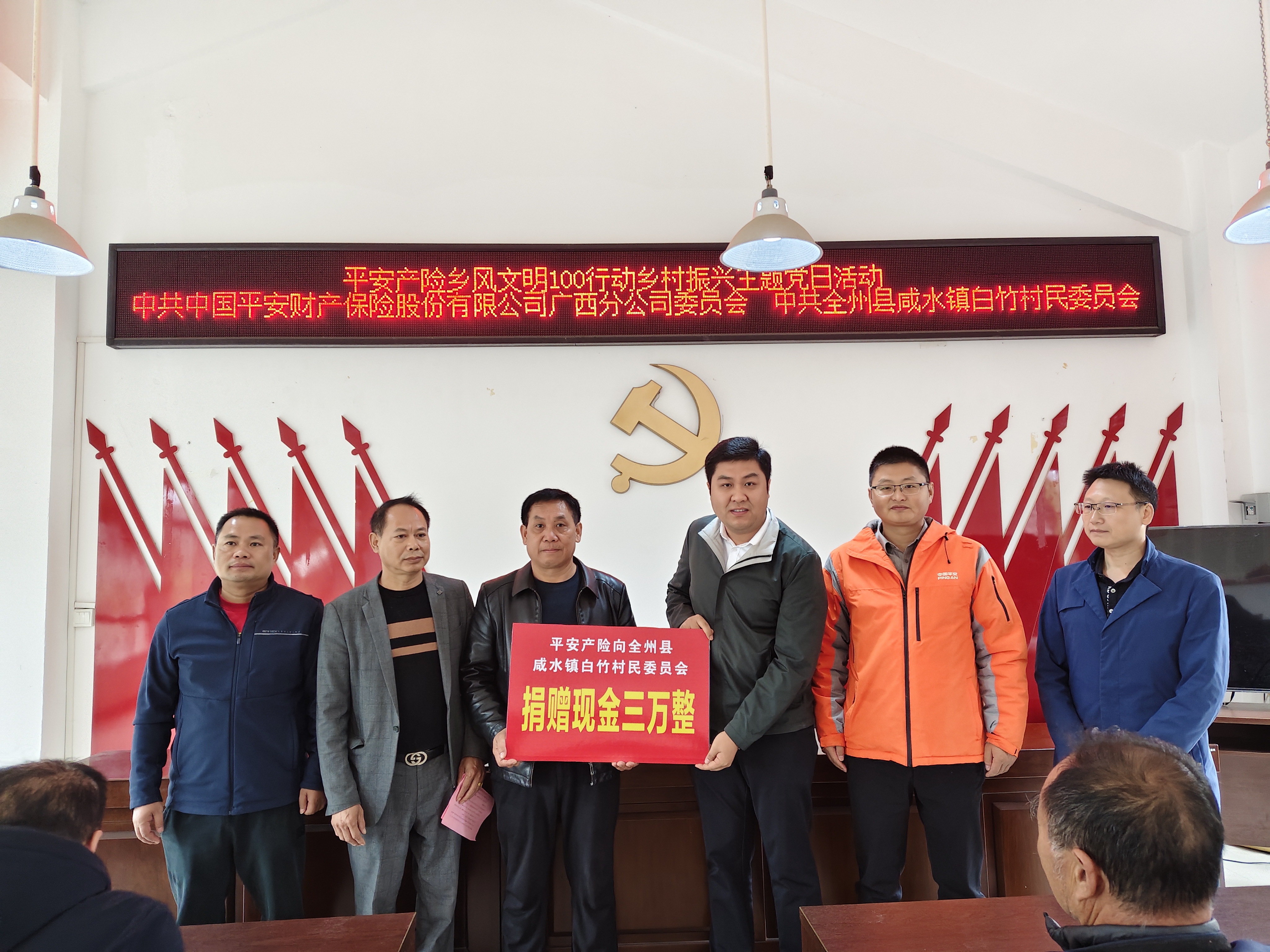 10月23日,中国平安财产保险股份有限公司广西分公司深入全州县咸水镇白竹村,开展“乡风文明100行动”公益项目爱心捐赠活动,此次活动以“筑牢党建基础,服务乡村振兴”为主题,通过资金支持、资源对接等方式,切实为该村产业发展注入了新的动力。