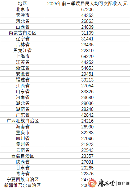 国家统计局网站公布了31个省份2025年前三季度居民人均可支配收入情况。今年前三季度,有11个省份居民人均可支配收入超过3万元。