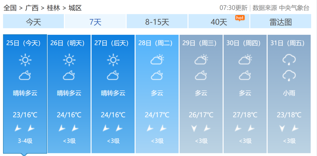 根据目前气象资料分析,由于路途遥远,这股冷空气暂时还不会影响到桂林,新一周(10月24日-31日),桂林将以多云到晴天为主,与常年同期相比,气温正常,雨量偏少。至10月31日,冷空气就会抵达桂林,带来阴天有小雨、局部中雨。